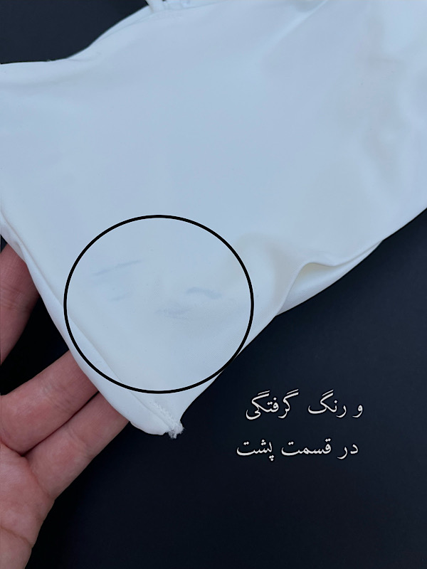 رنگ سفید : برجستگی هایی در پارچه در  بعضی نقاط نیم تنه هست و در قسمت پشت یک قسمت رنگ گرفتگی دارد